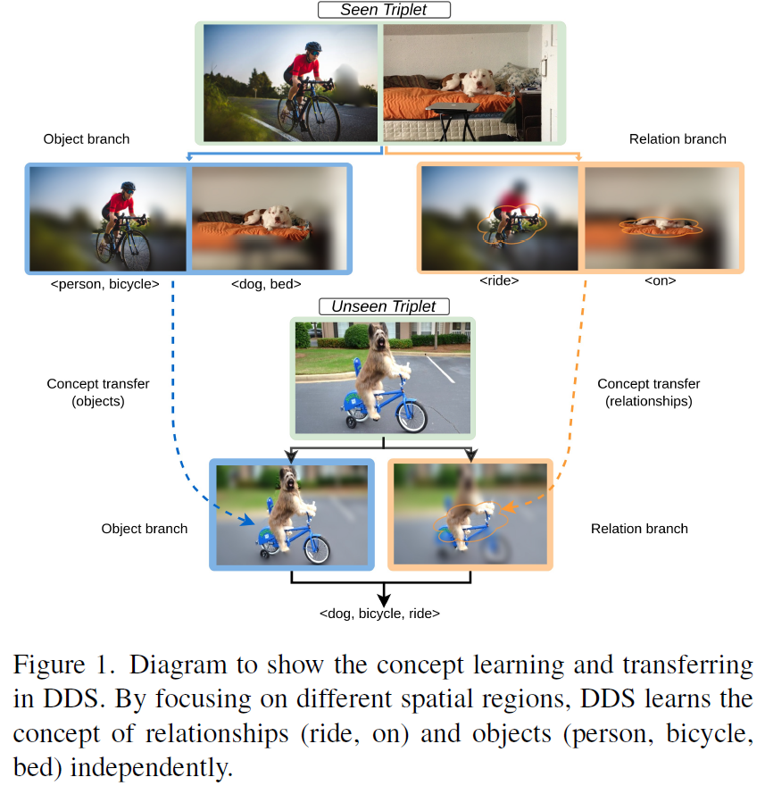 제안하는 DDS의 개념은 위 Figure 1.에 나와있습니다. DDS에서는 object와 relation의 특징 학습을 분리하기 위해 두개의 다른 branch를 구성하여 학습 및 예측을 수행합니다. 기존에는 물체 representation을 기반으로 관계를 예측해서 relation 예측이 물체에 bias되었는데(예측이 물체->관계 병렬구조), relation과 object 처리 branch를 분리해서 병렬적으로 예측을 수행해 처음 보는 triplet 조합을 기존보다 잘 예측할 수 있도록 하였습니다. 사실 핵심 아이디어는 이게 전부입니다. 간단하죠.