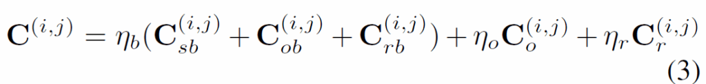 첫 번째 단계에서는 t번째 프레임에 대한 예측값과 GT값 사이 bipartite matching을 수행하는데, 이 때 subject, object box의 합집합으로 relation box를 정의하고 학습 시에만 사용합니다. matching cost metric은 다음 수식 (3)과 같이 정의됩니다.