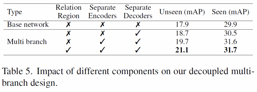 single-branch 구조인 비교군은 unseen 조합(처음 보는 <s-p-o> 조합)에서 낮은 성능을 보여, object와 relation 예측 브랜치를 쪼갠 DDS의 이점을 강조하고 있습니다. unseen, seen 모두 multi-branch가 낫긴 하네요. 이후 설계의 요소들을 ablation 비교하여 프레임워크 설계의 타당성을 주장하고 있습니다.
