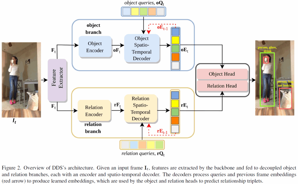 DDS 구조는 아래 Figure 2. 와 같습니다. 우선 비디오 프레임이 입력되면 CNN으로 특징 추출을 수행하고, 이렇게 추출된 특징들을 객체 인코더와 관계 인코더에 각각 입력해 특징을 강화합니다(학습을 통해 object / relation 예측에 특화되도록 강화되겠죠). 이후 object / relation 각 시공간 디코더(spatio-temporal decoder)는 해당 인코더로부터 전달된 embedding feature와 이전 프레임으로부터 전달된 embedding feature를 받아 query로 예측을 수행하도록 정보를 주고받습니다. 이후 디코더 출력(object / relation spatio-temporal embedding)을 relation head와 object head에 입력하여 최종 예측을 수행합니다.