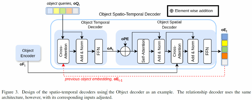 spatial decoder는 일반적인 트랜스포머 디코더의 구조와 비슷하게 구성됩니다. FFN, self-attention, cross-attention을 거치에 되는데, 각 브랜치마다 temporal deocder의 출력 query와 (r{A}_{t} or o{A}_{t})과 앞의 인코더에서 인코딩된 feature map (r{F}_{t} or o{F}_{t})를 입력받아 이들 간 CA를 수행합니다. 이후, temporal, spatial decoder를 거쳐 시간적, 공간적 문맥이 반영된 object query들은 relation / object 예측을 위한 embedding으로 사용됩니다. 이후 object / relation head로 입력되어 각각 최종 예측을 수행하게 됩니다.