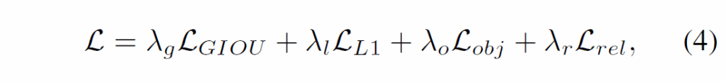 {C}_{sb}, {C}_{ob}, {C}_{rb}은 각각 subject, object, relation 영역의 matching cost이고, {C}_{o}, {C}_{r}은 각각 object, relation label matching cost입니다. DETR과 동일하게 예측값과 GT 간 최적의 매칭을 찾는데는 헝가리안 알고리즘을 사용합니다. 이후 학습이 진행될 때 다음 (4) 수식과 같이 loss가 계산됩니다.