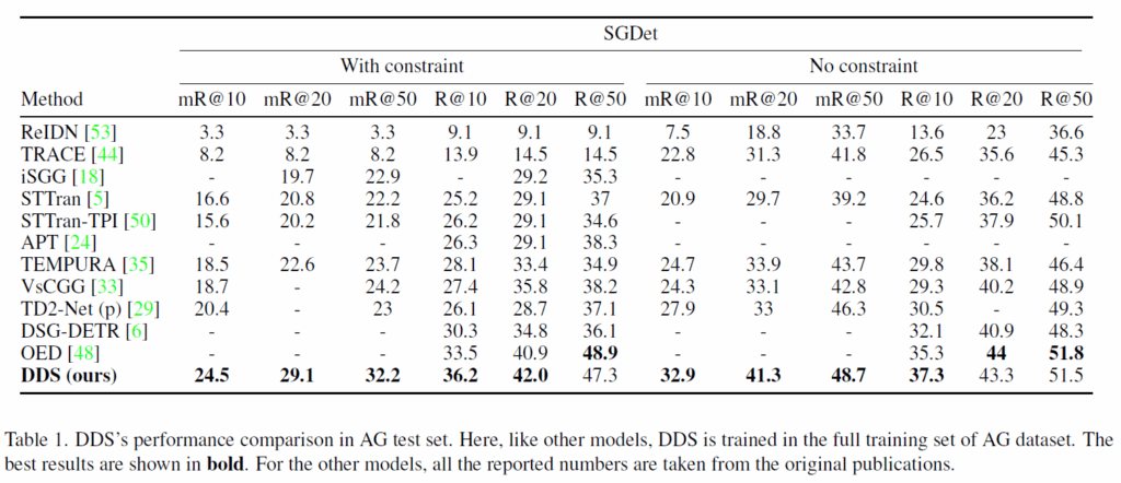 기존 video scene graph generation에서 메인스트림 프레임워크들은 Faster RCNN과 같은 기존 object detector로 모든 프레임의 물체를 예측하고, 이들의 정보를 모아서 temporal 정보를 반영해 relation 예측을 수행하는 2-stage로 수행되었습니다. 2024년부터는 transformer(특히 DETR구조) 기반의 1-stage 방법론들이 좋은 성능을 보여주었고, 많은 흐름이 이쪽으로 넘어왔습니다. DDS도 기본적으로 DETR 구조를 기반으로 하고 있습니다.