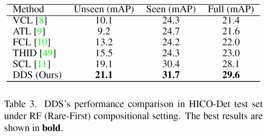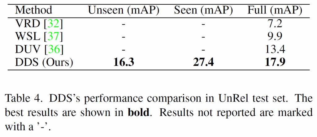 Table 3에서는 HICO-Det에서의 벤치마크 결과를 보였습니다. HICO-Det이라는 데이터셋은 거의 보기 힘든 데이터셋인데, 해당 데이터셋에서도 제안하는 DDS가 좋은 결과를 보여주었습니다. (HICO-Det과 UnRel 데이터셋에서는 지표로 Recall@K가 아닌, mAP가 사용되었습니다 )