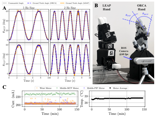 A는 LEAP Hand와 Orca hand의 정확도 및 지연시간을 비교하기 위해 2Hz, 5Hz의 사인파 패턴으로 작동 시킨 것을 나타내며, LEAP Hand 보다 더 부드러운 움직임이 가능하다는 것을 보였습니다. 하지만 tendon driven 방식 특성상 tendon을 장기적으로 조여야 된다는 단점이 있다고 합니다.
