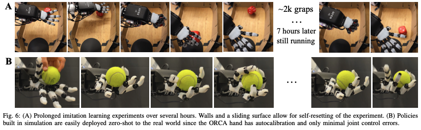 위의 사진으로 ORCA hand가 Imitation learning 과 RL model을 사용하여 학습하여도 신뢰성 있는 결과를 보여줍니다. B는 A2C architecture 로 sim 상황에서 병렬로 학습을 진행 후 실제 Orca hand가 손 안에서 물체를 돌리는 모습을 보여주며, A는 Imitation learning으로 학습된 policy를 통해 7시간 동안 pick and place를 하는 모습입니다. 저자는 7시간이 tendon이 끊어지거나 하드웨어적 이슈가 발생해서 7시간 동안 진행 한 것이 아니라 더 이상 진행해도 의미가 없겠다 싶어서 멈춘 것이라고 강하게 어필합니다.