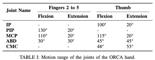 위의 표는 각 관절의 RoM을 나타낸 표입니다. ORCA-hand는 의도적으로 2~5번 손가락의 DIP 관절을 제거하였습니다. 이는 인간의 손에서 DIP 관절은 일반적인 task에서 구동되지 않기 때문에 정교한 조작에서 다른 관절보다 중요성이 낮다고 보았기 때문입니다. 이를 통해 조립과정이 단순화 되었다고 설명합니다. 따라서 2~5번 손가락은 3자유도 엄지 손가락은 4자유도를 갖게됩니다.