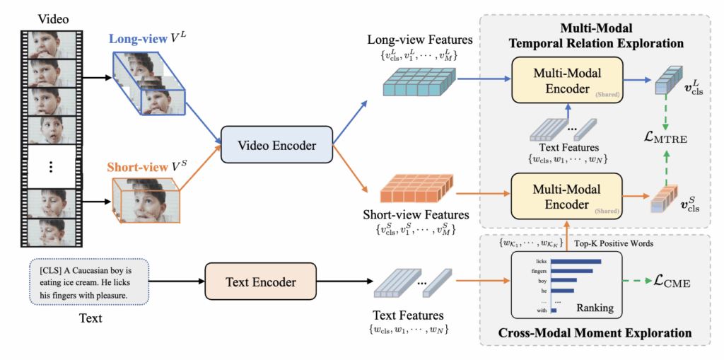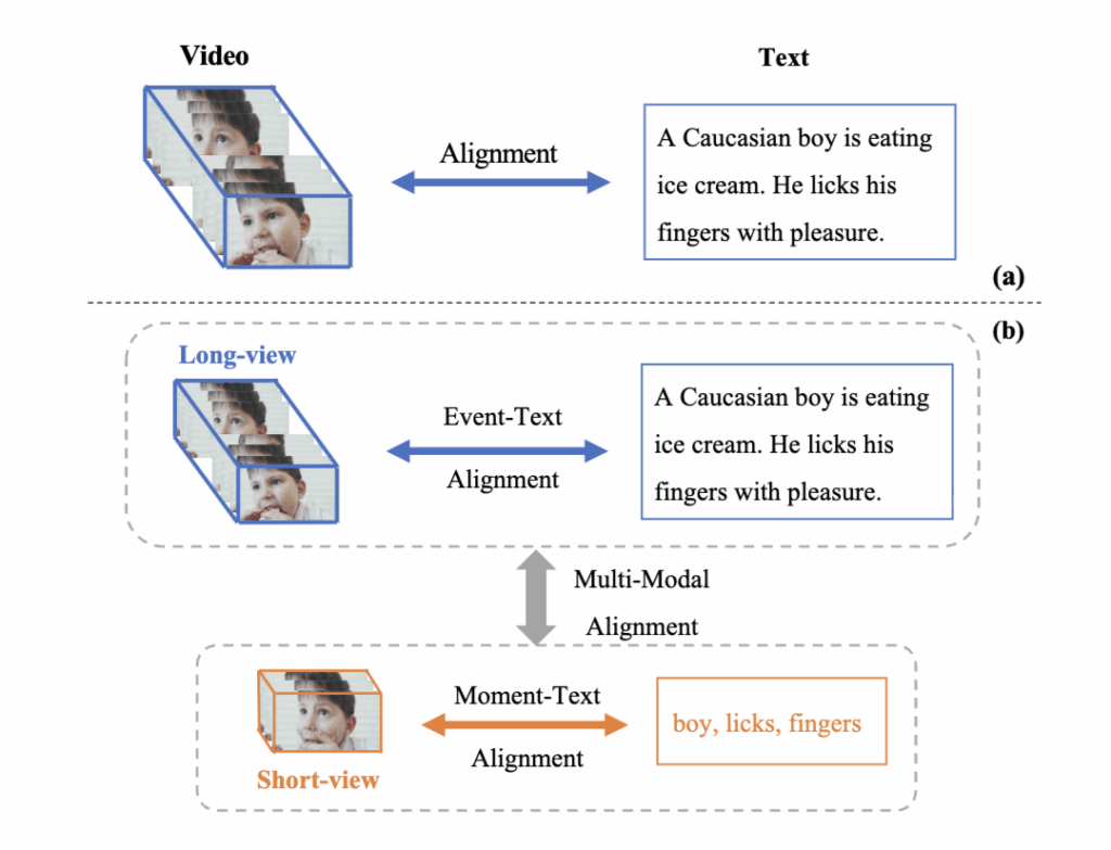 짧은 시간 구간(short-view)으로 구성된 비디오는 세밀한 순간(moment) 정보를 담고 있지만, 함께 제공되는 텍스트는 종종 비디오의 일부만을 설명하기 때문에 노이즈가 포함될 수 있습니다. 예를 들어, “아이스크림을 먹는 소년”이라는 캡션은 실제로는 ‘손가락을 핥는 장면’만 담긴 짧은 구간과 정확히 일치하지 않을 수 있죠. 이러한 불일치는 모델이 순간 단위 정보를 학습하는 데 방해가 됩니다.