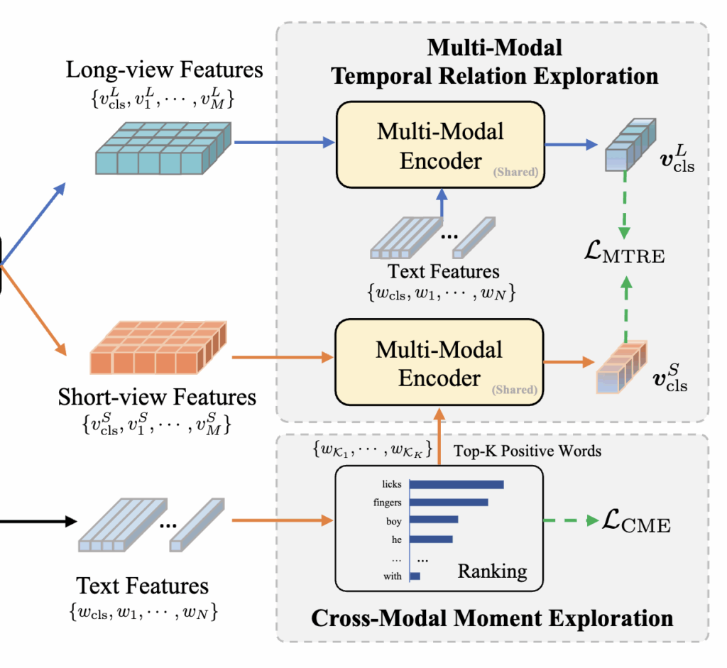 Multi-Modal Temporal Relation Exploration (MTRE): 긴 구간(long-view)과 짧은 구간 간의 관계를 학습하여 사건(event) 간 시간적 맥락과 인과성을 모델링