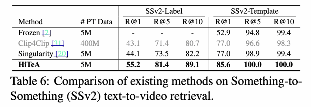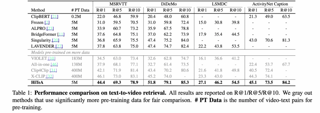 즉, HiTeA는 단순한 검색이나 캡션 생성뿐 아니라, 비디오 이해와 시간적 추론 능력까지 포괄적으로 검증될 수 있는 실험 세팅을 구성하였다고 합니다.