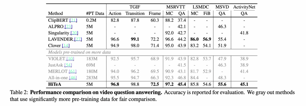 9개의 VideoQA 데이터셋에서, HiTeA는 적은 사전학습 데이터로도 대부분의 벤치마크에서 최고 성능을 달성했습니다. 이러한 결과는 CME 모듈을 통해 학습된 순간 단위 정보가 질문의 단서(clue)를 찾는 데 효과적임을 보여준 것입니다.