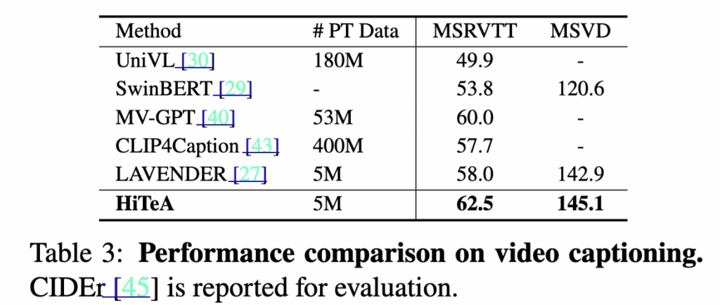 MSRVTT와 MSVD 캡셔닝 실험에서 HiTeA는 기존 대규모 사전학습 모델보다 적은 데이터로도 높은 생성 성능을 달성했습니다. 특히 MSRVTT Caption에서 SoTA 모델인 MV-GPT보다 2.5% 높은 CIDEr 점수를 기록했습니다. 재밌는 점은 MV-GPT가 오디오 기반 전사(ASR) 정보까지 추가 입력으로 사용하는 반면, HiTeA는 순수히 비디오 입력만으로 이 성능을 달성했다는 점입니다. 이는 HiTeA가 시간적 문맥과 순간적 정보를 동시에 학습하는 강력한 표현력을 지녔음을 보여준다고 하네요.