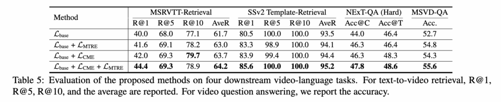 두 개의 핵심 Loss항인 L_\text{CME}과 L_\text{MTRE}의 영향을 분석한 결과, 두 Loss를 함께 사용했을 때 Text-to-Video Retrieval과 VideoQA에서 각각 +1.7% (Average Recall), +2.9% (Average Accuracy) 향상이 있었습니다. 또한 MSRVTT 데이터셋에서는 L_\text{CME} 단독 성능이 L_\text{MTRE}보다 더 우수했는데, 이는 CME가 텍스트에서 positive words뿐 아니라 행동 객체까지 선택하여 정렬 정확도를 높였기 때문이라고 합니다. 즉, CME는 비디오 속 ‘행동(action)’과 ‘대상(object)’의 세밀한 매칭에 효과적인 것으로 나타났습니다.