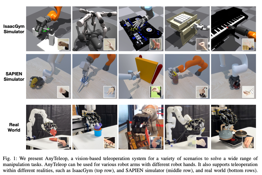 Vision based teleoperation은 로봇이 저렴한 카메라 센서만으로도 환경과 물리적으로 상호작용 할 수 있는 가능성을 제공합니다. 하지만 현재 vision teleoperation system은 특정 로봇 모델 그리고 특정 환경으로 설계되어서 다양한 변화에 대한 system의 확장성은 떨어진다고 합니다. 따라서 오늘 리뷰할 논문에서는 single system 내에서 다양한 로봇, 환경 구성을 지원하는 general한 teleoperation system인 AnyTeleop을 제안합니다. AnyTeleop는 하드웨어 선택에 대한 강인성을 제공하면서도, 뛰어난 성능을 보인다고 합니다. 대박인 것은 real world에서 AnyTeleop는 특정 로봇 하드웨어에 맞춰 설계된 기존 teleop system보다 더 높은 성공률을 보인다고 합니다. sim 환경에서의 teleop인 경우에도 이전의 해당 sim에 특화된 기존 방식들보다 더 좋은 imitation learning performance를 이끈다고 합니다.