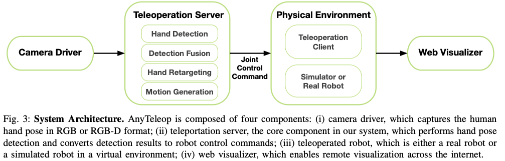 논문에서는 이를 달성하기 위해서 human motion을 robot motion으로 learning 없이 실시간으로 변환하는 general and high performance motion retargeting library를 개발했다고 합니다. 또한 충돌 회피 모듈은 cuda 기반 geometry queries를 사용하는 learning free 기법이라고 합니다. 이들은 URDF 파일과 같은 kinematic 모델만 주어지면 새로운 로봇에 적응할 수 있다고합니다. 두번째로, 표준 브라우저와 호환되는 웹 기반 뷰어를 개발하여 simulator에 구애받지 않는 시각화를 구현하고 인터넷을 통해 teleoperation을 가능하게 한다고 합니다. 세번째로, visoin based teleoperation을 위한 일반적인 software interface를 정의하여 teleoperation 시스템 내부의 각 모듈을 표준화하고 분리합니다. 이를 통해 다양한 simulator나 실제 하드웨어에 원활하게 배포할 수 있다고 합니다.