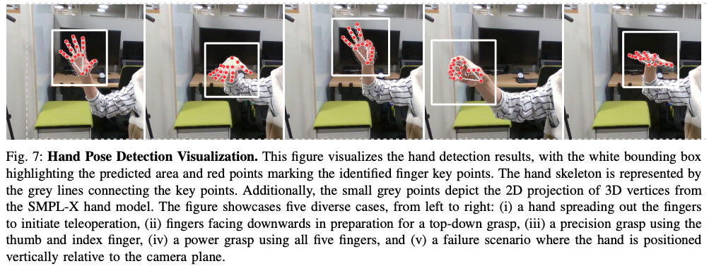 RGB only인 경우 손목의 pose를 추정하기 어려운데 논문에서는 FrankMocap에서 사용된 방식을 채택하여, 손목의 6D pose를 근사했다고 합니다. 이는 depth 정보가 있는 것보다는 정확성이 적지만 teleoperation에서는 충분한 정확도를 제공한다고 언급합니다.