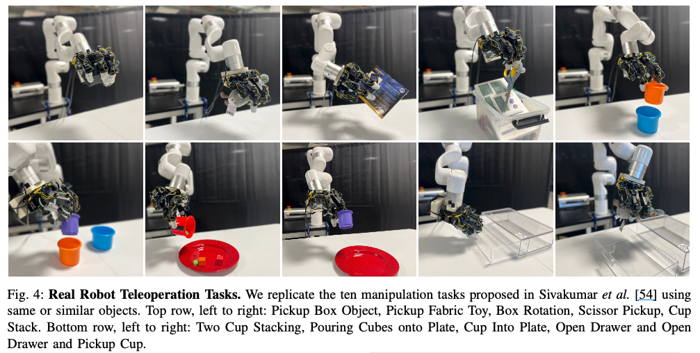 Real world에서 robot task에 대한 공정한 비교는 똑같은 환경을 만들어서 비교하기 매우 어렵습니다. 따라서 논문에서는 Robotic Telekinesis에서 제안된 10개의 manipulation 작업을 동일한 XArm6, Allegro hand 그리고 유사한 물체를 사용해서 Task를 진행하였습니다. 각 작업을 10번 수행하였고, 단일 intel realsense 카메라를 사용했다고 합니다!