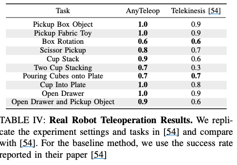 Anyteleop는 실험 결과에서 매우 좋은 성능을 보였다고 합니다. real world Teleoperation인 경우, 이전 시스템 보다 높은 성공률을 보인다고 합니다. 논문에서는 10가지의 task중 8가지에서 동일한 로봇 기준 더 좋은 성능을 보인다고 하고, sim 상황인 경우 6가지 task 중 5가지에서 더 높은 성공률을 보였다고 합니다. 이로 인해 더 나은 Imitation learning 결과를 가져올 수 있다고 합니다. 마지막으로 다른 vision based teleoperation system과는 다르게 collaborative manipulation을 지원한다고 합니다.