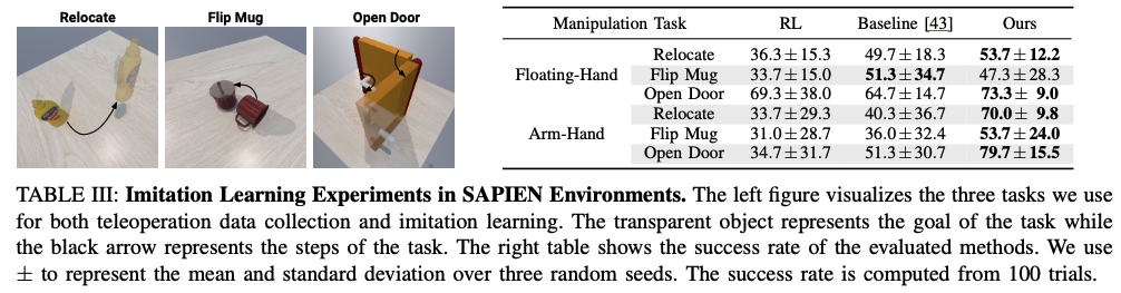 공정한 비교를 위해 동일한 환경의 simulation 상에서 진행되었으며 Imitation 알고리즘은 Demo Augmented Policy Gradient 방식이 사용되었다고 합니다. task는 Relocate, Flip Mug, Open Door로 구성되었습니다. 그리고 Floating hand는 robot arm 없이 hand만 둥둥 떠다니는 환경이고, Arm-Hand는 robot Arm에 hand가 부착되어 있는 상황입니다. 논문에서는 50개의 demo 궤적을 RGB-D 카메라 하나를 사용해서 수집하였다고 합니다. 기존 baseline 방식은 floating hand 방식만 지원하며, 이 궤적을 arm-hand 형식으로 변환한다고 합니다. AnyTeleop는 Arm-Hand 방식으로 수집하고 이를 Floating hand 형태로 변환하여 모든 버전에서 사용할 수 있게 했다고 합니다.