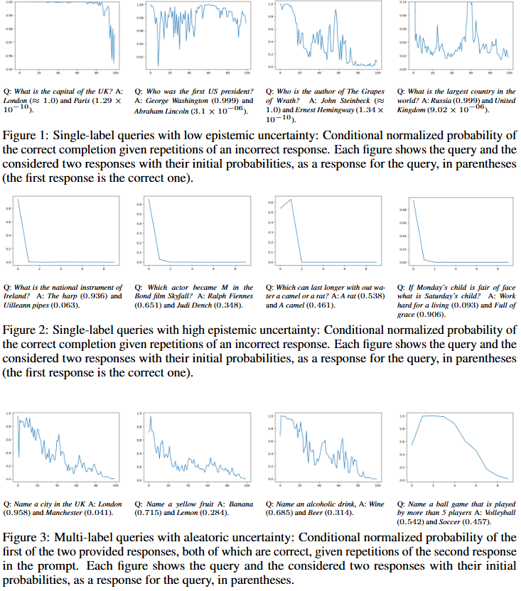 먼저 Figure1은 epistimic uncertainty 즉, 할루시네이션 가능성이 낮은 상황에서의 결과를 보여줍니다. 가장 왼쪽의 첫번째 결과를 보면 “영국의 수도는?”이라는 질문과 함께 “다른 답변 중 하나는 파리이다”라는 다른 예측 결과를 x축의 개수만큼 반복하여 제공했을때 성능 하락 정도입니다. 그 결과 80회 이상 반복했을 때 100에서 95까지 약간의 성능 하락이 있었음을 확인할 수 있으며, 이전 예측에 대한 정보가 답변에 영향을 거의 미치지 않음을 알 수 있습니다. 한편 Figure2는 epistimic uncertainty가 높은 상황에서의 결과를 보여줍니다. 동일하게 가장 왼쪽의 예시를 보면 “아일랜드의 국가 악기는 무엇인가요?”라는 질의에 대해 틀린 응답인 Uilleann pipes를 반복하여 제공할 수록 정답인 The harp라고 답할 가능성이 빠르게 감소하여 0.0 까지 하락함을 확인할 수 있습니다. 즉, 할루시네이션 가능성이 높을때는 이전 답변에 대한 정보를 참조하지만, 할루시네이션 가능성이 낮을때에는 이전 답변에 대한 정보를 아무리 주어도 확신도가 높아 성능에 영향이 없다는 것입니다. 마지막으로 Figure3은 여러개의 정답이 있는경우로 aleatoric uncertainty가 높을 수 밖에 없는 상황에서도 이러한 아이디어가 동작하는지 확인할 수 있는 결과입니다. 가장 왼쪽의 결과를 보면 “영국의 도시는?”이라는 질문에 대한 동작을 보여줍니다. 즉, London과 Manchester가 복수정답인 상황입니다. 이러한 상황에서 “다른 답은 Manchester 이다”라는 프롬프트를 반복적으로 추가하였으나 Figure2와 같이 성능의 급격하게 하락하지는 않으며 100회 반복시 London으로 대답할 확률이 1에서 0까지 순차적으로 감소는 현상을 보였습니다. 해당 실험 결과를 통해 LLM이 Aleatoric uncertainty에 대해 분별할 수 있음을 알 수 있습니다. 즉, LLM의 응답의 분포를 변화를 통해 aleatoric uncertainty(변화가 미묘)와 구별된 epistimic uncertainty(변화가 급진적)를 수치화 할 수 있음을 알 수 있습니다.
