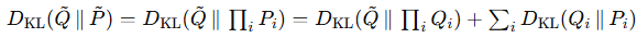 한편, 정답 분포(P~)와 예측(Q~)간의 분포 거리는 독립 분포로 곱 분포이며 아래와 같이 분해될 수 있습니다.