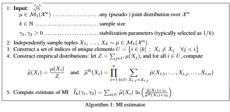 산출식을 설명하면 아래와 같습니다. k번의 반복시행을 통해 sample tuples(M)을 생성합니다. i번째 응답과 전체 샘플(M)간의 분포 차이를 μ^ⓧ, i번째 추론의 정규화된 분포는 μ^ 입니다.(line4) MI는 이 두 수치를 통해 계산되는데, 두 수치가 0이 됨을 방지하기 위해 γ1​,γ2를 정의하여 활용합니다. 두 보정 파라미터는 γ2>=γ1의 관계를 만족하는것이 일반적이지만 보통 1/k로 세팅되에 샘플링 표본의 수가 증가하면 0에 가까워집니다.