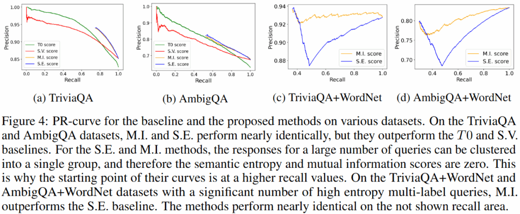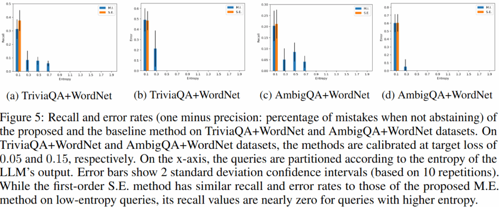 실험 결과 단일정답중심에서는 제안한 방법이 T0, S.V.보다 우수하며 S.E.와 유사한 성능을 보였습니다. 단일 정답이기 때문에 S.E. 기법으로 충분히 불확실성을 감지할 수 있기 때문인데요, 한편 다중 정답 중심 세팅(Figure4/c,d & Figure5) 에서는 M.I. 기법이 S.E. 기법보다 높은 할루시네이션 감지율을 통해 직접적인 원인인 epistimic uncertainty만을 잘 수치화하였음을 보여주었습니다.