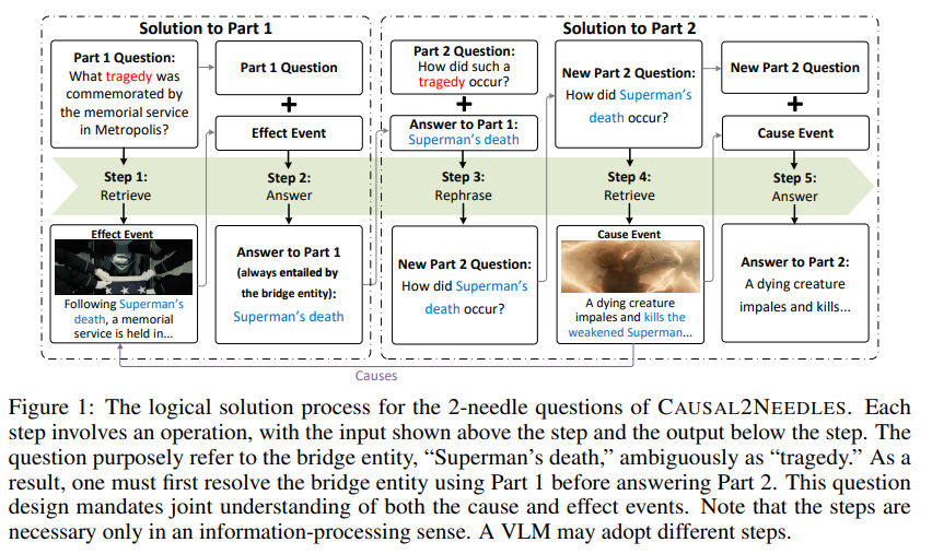 Causal2Needles의 핵심은 바로 2-needles 질문의 구성입니다. 저자는 단순히 관련된 사건을 물어보는 것을 넘어서 질문 자체를 두 파트로 나누어 모델이 순차적으로 추론할 수 있도록 유도했습니다. 저자는 bridge entity를 도입했는데, 이거는 원인과 결과에 공통된 정보를 의미합니다. 2-needles 질문에서 파트1은 bridge entity를 알아내기 위한 결과에 관한 질문을 하고 파트2는 파트1에서 얻은 정보를 토대로 원인에 대한 질문을 합니다. 저자는 만약에 이 bridge entity가 직접적으로 질문에 연관되어있다면 1-needle 질문과 동일하기 때문에 직접적으로 이러한 bridge entity를 언급하지는 않는다고 합니다. 예를 들어 실제 영화 속 사건이 “슈퍼맨의 죽음”이 원인이 되어 “메트로폴리스에서 그의 추모식이 열렸다”일때 bridge entity는 슈퍼맨의 죽음입니다.ㅏ 저자는 파트1 질문은 “메트로폴리스 추모식에서 기념된 비극은 무엇인가”로 제히됩니다. 이것만으로는 기념된 비극이 무엇인지 알 수 없기 때문에 저자는 추모식 장면을 찾아야하고 기념된 비극이 슈퍼맨의 죽음임을 알아내야합니다. 파트2는 그 지극이 어떻게 발생했는가로 주어집니다. 이러한 관계를 통한 논리적인 과정을 통해 질문에 답해야하는 2-needles 질문은 Figure 1에서 확인할 수 있습니다.