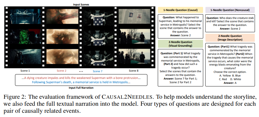 긴 비디오 줄거리는 텍스트로 구성된 내래이션이 영상을 이해하는 데에 큰 도움을 줍니다. 하지만 이는 자칫하면 모델이 영상을 보지않고 텍스트만으로 답을 추론하는 텍스트 편향이 일어날 수 있습니다. 이를 방지하기 위해 Causal2Needles는 2-needle 질문은 두가지 방식으로 구성되어 있습니다. 하나는 visual grounding 형식입니다. 이 형식에서는 모델이 답을 찾은 후에 그 답이 있는 비디오의 위치를 grounding 합니다. 정확하게는 grounding이 아니라 장명의 index를 고르게됩니다. 어느 장면에 답이 있는지 번호를 고르는 것으로 reasoning 능력을 간접적으로 확인할 수 있습니다. 이렇게하면 영상의 이해가 기반이 되어야하므로 텍스트에만 편향되는 것을 막을 수 있습니다. 두번째 방식은 image description 형식입니다. 파트2 질문을 약간 변경하는 것으로 원인 장면을 보지 않는 다면 이해하기 어려운 세부 정보를 묻게 되고 객관식 선택지를 제안합니다. 예를 들면 “그 비극(슈퍼맨의 죽음)이 발생하는 장면에서 괴물이 발사한 에너지 빔의 색은 무슨 색인가”를 질문하고 A.노랑, B.파랑, C.빨강, D.하양 으로 제안합니다. 이때 정답은 실제로 정답의 근거가 되는 구간의 시각적 정보가 없다면 알 수 없는 정보로 저자는 이러한 구성을 통해서 image description 형식이 텍스트에만 의존하는 것을 어렵게 만든다고 주장하고 있습니다. 만약에 모델이 영화에서 괴물이 쏜 빔의 색을 기억하고 있는 다면 사전지식을 통해 정답을 맞출 수 있습니다. 따라서 저자는 위의 visual grounding과 image description 두가지 방식을 통해서 모델의 성능을 다각도로 평가할 수 있습니다.