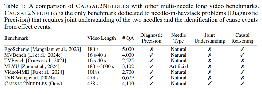 안녕하세요. 오늘 제가 리뷰할 논문은 이번 NIPS 2025년에 공개된 논문입니다. 논문은 긴 비디오에서 인과적으로 연결된 두 지점(Needles)를 찾아 이해하는 능력을 평가하는 데이터셋인 Causal2Needles를 제안합니다. 기본적으로 QA 데이터셋이지만, 긴 비디오에서 인과관계를 정확하게 이해하고 위치 또한 찾아야하는 어려운 난이도의 데이터셋으로 모델의 Answering과 Reasoning 그리고 Grounding 능력을 요구합니다.