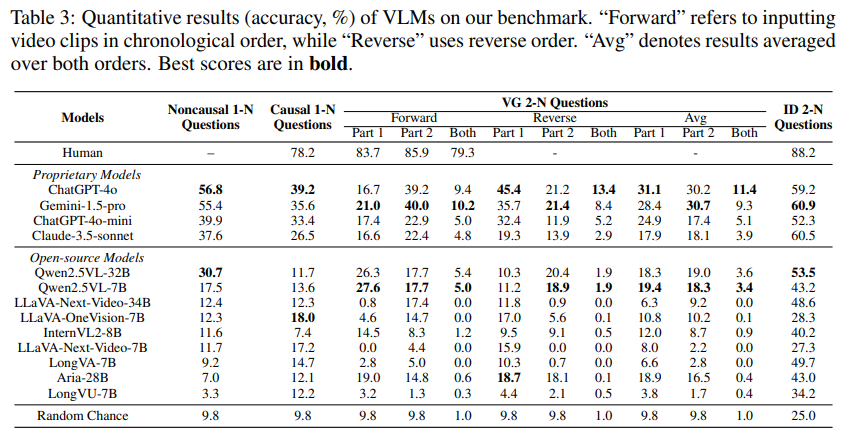 그럼에도 불구하고 긴 비디오 이해를 위한 벤치마크들이 존재하지 않는 것은 아닙니다. 최근 몇년 동안 긴 비디오 이해를 위한 벤치마크들이 여럿 제안되었고, 긴 비디오 이해를 위한 연구 또한 점점 관심을 받고 있었습니다. 하지만, 기존 모델과 벤치마크에는 명확한 약점이 존재합니다. 현재 학계에서 LVU 모델 학습과 평가를 위해 많이 사용되는 데이터셋들인 MLVU, VideoMME, LongVideoBench 등의 데이터셋들은 다중 시점에 걸친 물체의 색, 개수 등의 속성을 고려한 QA가 존재하긴 했었지만 대부분의 질문은 여러 시간대의 프레임을 독립적으로 식별하면 해결할 수 있는 QA들이었고 표면적인 단서를 맞추기만하면 정답을 맞출 수 있기에 장면 간의 복잡한 추론 능력은 요구하고 있지 않습니다. 두 장면 이상의 독립된 사건을 연결지어 이해해야하거나 인과관계를 추론하도록 설계된 데이터셋은 존재하지 않았습니다.