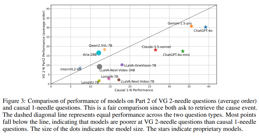 Figure 3은 여러 MLLM의 1-needle과 2-needle 성능을 비교하고 있습니다. GPT-4 계열의 모델 조차도 2-needle에서는 큰 성능 감소 있는 것을 확인할수 있습니다. 이것은 아직 긴 비디오 이해를 위해 연구가 아직 더 진행되어야한다는 것을 의미합니다. 이후에는 긴 문맥 이해 능력을 키우기 위해서라도 복잡한 질문을 평가하는 것이 필수적임을 알 수 있습니다.