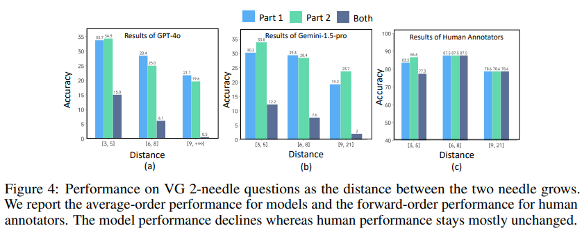 Figure 4는 1-needle과 2-needle 질문에서 두 연관된 장면의 거리에 따른 성능의 차이를 보여줍니다. 두 장면 사이의 거리가 멀어짐에 따라 모델의 성능이 낮아지는 것을 확인할 수 있습니다. 이를 통해 기존 모델들이 긴 비디오에서 복잡한 추론 능력이 떨어지는 것을 확인할 수 있습니다.