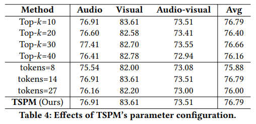 저자는 핵심 악기와 관련된 시각적 영역을 식별하기 위해 SPM 을 설계하였습니다. 간단하게 얘기하자면 선택된 시간 구간 내에서 시각 토큰들을 유사도 기반으로 병합하여 그들의 의미를 보존하는 설계입니다. 기존 연구가 질문과 시각 토큰 간의 의미 유사도를 기반으로 중요한 영역을 식별하려 했지만 이들 토큰 내 객체에 대한 의미 정보가 부족해 소리와의 효과적인 상관 관계를 구축하기 어려웠다고 합니다. 이를 해결하기 위해서 저자는 선택된 핵심 시간 구간을 시각 토큰들의 의미 정보를 더 잘 보존하도록 강화했다고 하며 유사한 토큰들을 각 프레임 내에서 병합함으로써 객체에 대한 더 풍부한 의미 정보를 갖는 병합 토큰이 생성되게 했습니다.
