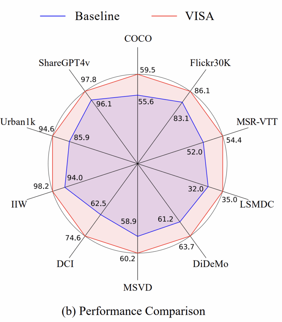 베이스라인으로 LoTLIP을 사용했고, VISA를 결합했을 때 모든 데이터셋에서 R@1 성능이 크게 향상되었습니다. 특히 DCI에서 62.5% → 74.6%(+12.1%), Urban1k에서 85.9% → 94.6%(+8.7%)로 성능이 향상되며, 복잡한 장면 서술이나 긴 문장의 핵심 요소를 안정적으로 포착한다는 점을 보여주었습니다. 물론 IIW(+4.2%), ShareGPT4v(+1.7%)에서도 성능 개선이 있었죠.