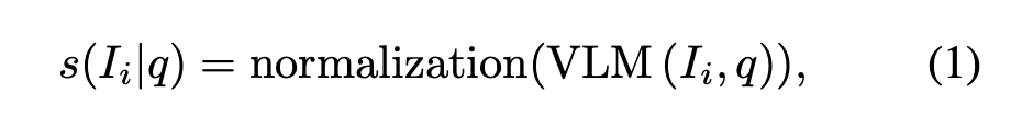기존 VLM 기반 TVR 모델은 텍스트와 비주얼을 같은 임베딩 공간에 매핑해 유사도를 계산하는 방식으로 동작합니다. 즉, 주어진 쿼리 q와 후보 이미지 I_i가 있을 때, 모델이 출력하는 기본 유사도 점수 s는 다음과 같이 표현합니다