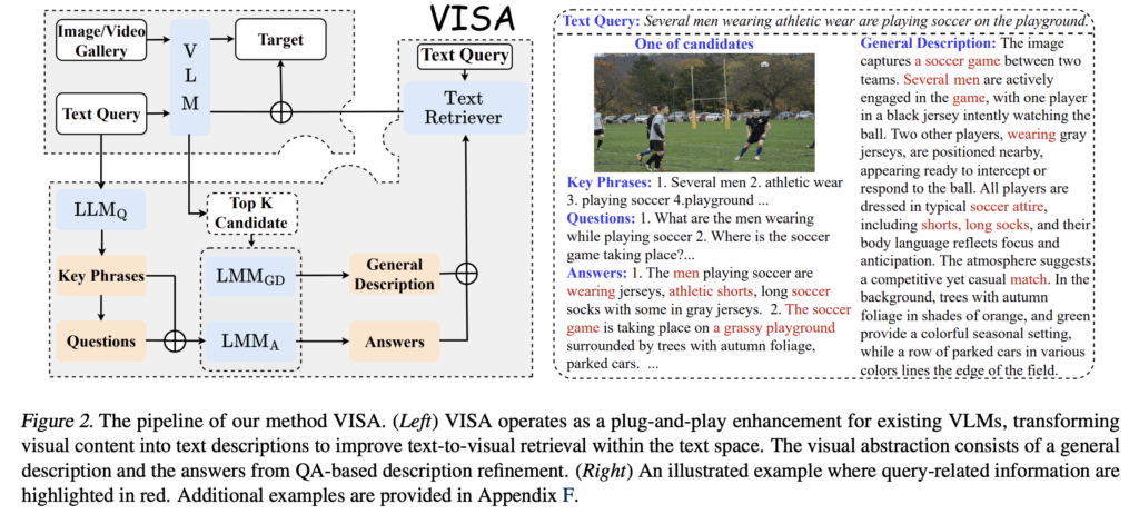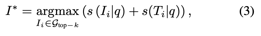 VISA는 이 문제를 “plug-and-play” 방식으로 해결했는데요, 바로 retrieval을 한 번 더 텍스트 공간에서 재정렬(reranking) 하는 것입니다. 즉, 먼저 기존 VLM으로 top-k 후보 \mathcal{G}_{top-k}​를 뽑고, 그 다음 각 후보 이미지를 자연어 설명 T_i으로 바꿔 다시 텍스트-텍스트 매칭을 수행합니다.