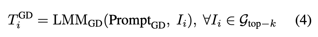 VISA는 먼저 top-k 후보 이미지 각각을 LMM을 통해 설명문 형태로 바꿔주는 과정을 거칩니다. 이때 생성되는 긴 문장 T_i^{GD}​는 다음 수식처럼 이미지를 문장으로 변환하는 함수로 볼 수 있습니다: