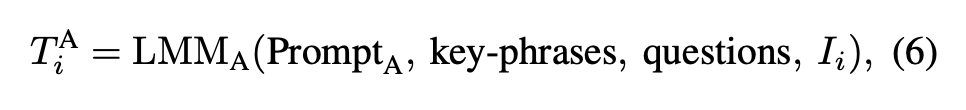 이 질문들은 명확히 답할 수 있어야 하고, 쿼리와 동일한 granularity를 유지해야 한다는 기준 아래 생성되며, LMM이 시각 정보만 보고 확실하게 판단할 수 있도록 설계되었습니다. 각 질문에 대해 후보 이미지 I_i를 보고 다시 LMM이 답변을 생성하면, 그 결과가 T_i^A​로 기록됩니다: