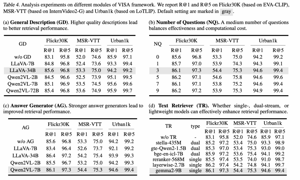 마지막으로 VISA는 일반 설명 T_i^{GD}​과 QA 기반 세부 설명 T_i^{A}​을 이어 붙여 최종 텍스트 표현 T_i을 구성합니다. 이렇게 만들어진 묘사는 쿼리와 granularity가 맞춰진 형태가 되어, 이후 텍스트 기반 재정렬 단계(Eq. 2, 3)에서 훨씬 안정적인 검색 성능을 제공할 수 있었다고 하네요