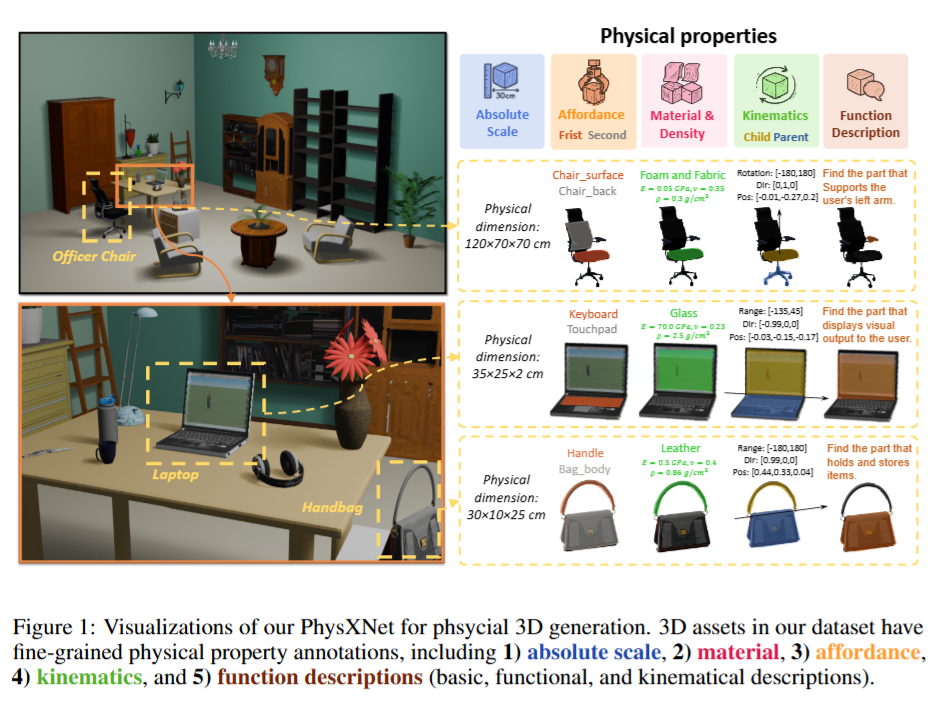 저자들은 이러한 문제를 해결하기 위해 위의 figure 1과 같이 물리 정보를 포함한 3D 에셋 생성의 접근을 처음으로 제시했습니다. 저자들은 PhysX-3D라는 파이프라인을 통해 기존의 3D 객체의 구조와 더불어 다섯 가지 물리적인 속성을 고려하는 end to end 생성 프레임워크를 제안했습니다. 이를 위해 대규모의 물리적인 속성이 annotation된 3D 데이터셋인 PhysXNet, 학습된 물리 지식을 활용하여 이미지를 3D asset으로 변환하는 PhysXGen을 제안했습니다. PhysXNet 데이터셋은 3D 객체에 대한 absolute scale, material, affordance, kinematics, function description 총 5가지 물리적 요소들을 직접 주석을 달아서 제공하며, 이를 통해 각 객체에 대한 중력, 마찰, 접촉 영역, 운동 궤적 등 동역학적 시뮬레이션에 필요한 정보를 추로너할 수 있게 했다고 합니다.