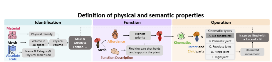 예를들어, properties에 대한 framework 설명하는 그림에서는 일단 Mesh랑 Material에서부터 시작하는 것 같은데 그럼 Mesh랑 Material 정보는 이미 기존에 제공되어 있으니 Affordance와 Kinematics, Function description만을 VLM으로 auto labeling하면 되는 것일까요?