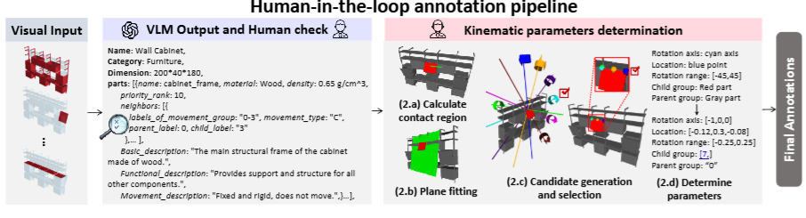 사실 제안된 물리 annotation은 굉장히 방대하기 때문에 효율적이고 정확하게 달기 위한 방법이 필요했고, 저자들은 이를 위해 human-in-the-loop 파이프라인을 제안했습니다. 수동으로 수만 개 객체의 모든 파트를 주석하는 것은 불가능에 가깝기 때문에, VLM의 힘을 빌리되 사람의 검수와 보정을 거쳤다고 합니다. 전체 파이프라인은 <Fig. 2> 와 같습니다. 크게 예비 데이터 획득, 운동학 파라미터 결정으로 구성되어 있습니다. 이를 좀 더 세분화하면 다음과 같습니다.