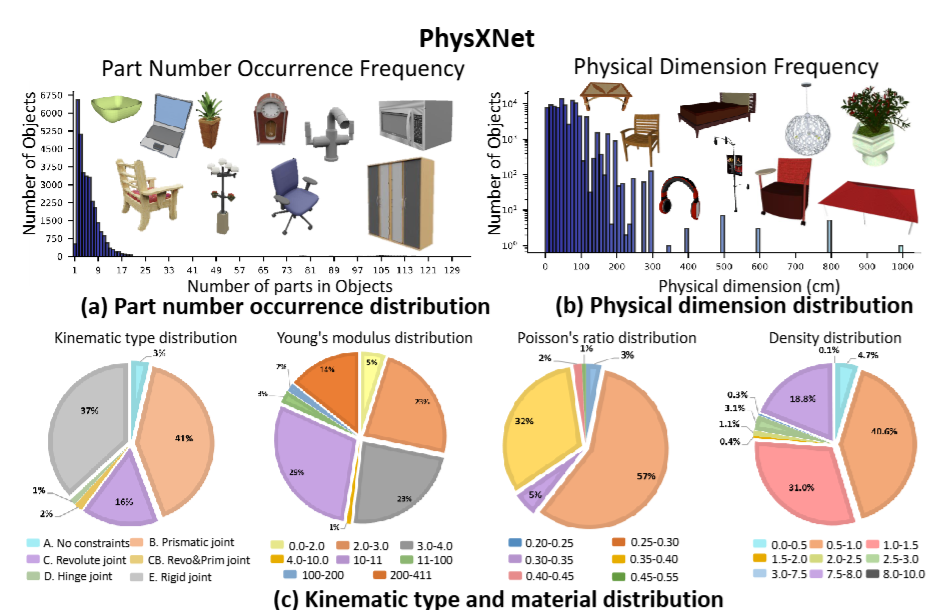 이러한 과정을 통해 저자들은 아래 figure와 같이 26000개의 3D 객체를 포함하며, 평균 5개의 part를 갖는 데이터를 생성했다고 합니다. PhyXNet 데이터셋 자체가 PartNet 기반이라 객체들은 소형 가구부터 대형 구조물까지 굉장히 넓은 범위로 들어있다고 합니다.