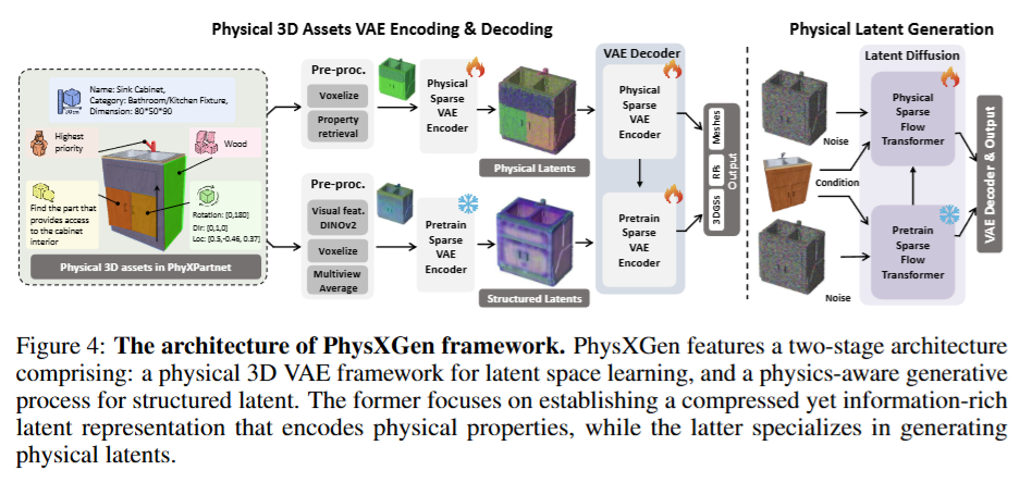 PhysXGen의 구조는 figure 4와 같이 Physical 3D VAE 프레임워크를 통한 latent 공간 학습 단계, latent 생성 단계로 나뉘어져 있습니다. 기존 3D 구조/형상 정보와 새로운 물리 속성 정보를 각각의 latent로 표현한 다음, 이 둘을 동시에 생성하는 diffusion 기반의 generator를 학습하는 식입니다. 큰 틀에서는 TRELLIS와 같이 structured latent 기반으로 보시면 될 것 같습니다. 그래서 DINOv2의 feature와 voxelize된 구조를 통해 latent로 인코딩하고 디코딩 하는 쪽은 freeze하고 진행합니다.