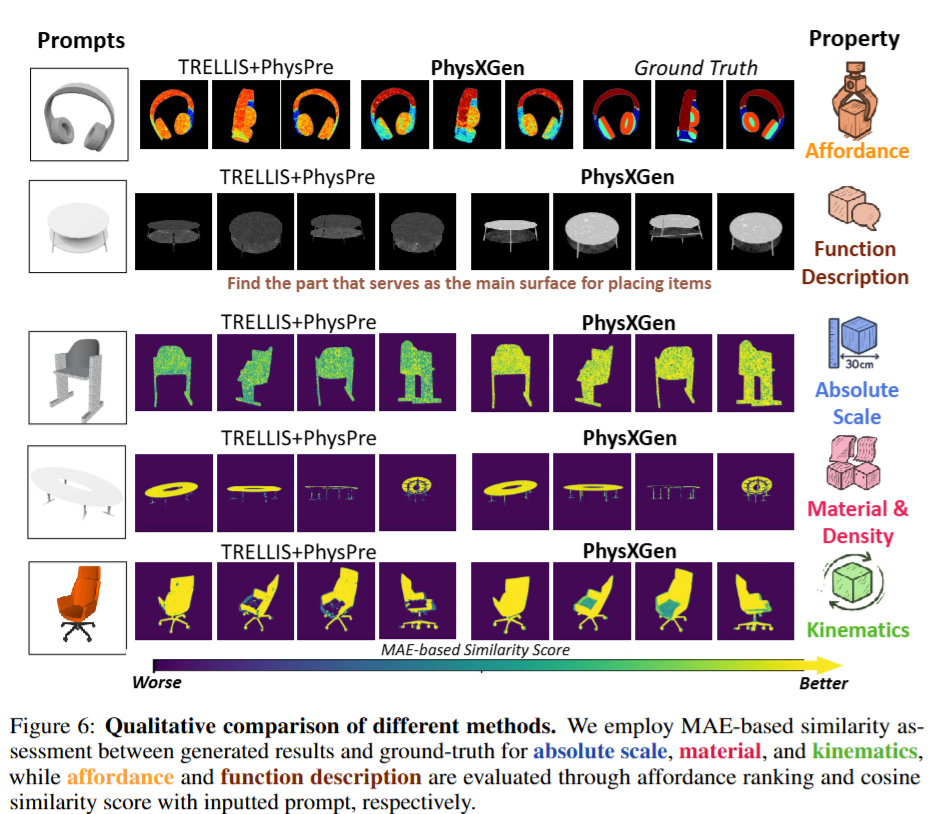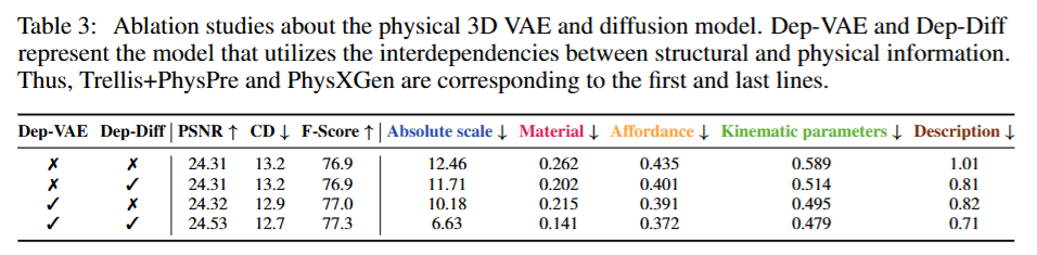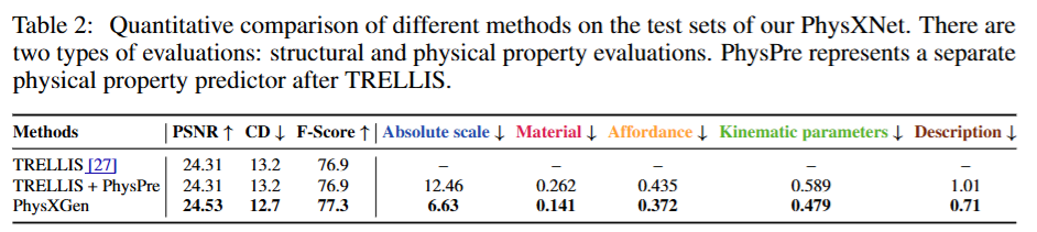 실험은 모두 PhysXNet 데이터셋을 기준으로 이루어졌고, 24K의 객체로 학습하고 각각 Validation과 Test가 1K씩이라고 합니다. Trellis모델을 베이스라인으로 생성된 모델 기반으로 물리적인 요소들을 예측해 직접적으로 저자들이 제안한 방버론과 비교했다고합니다. Absolute scale, Material, Affordance rank, Kinematic parameter, function description과는 각각 cm 단위의 MAE, rank difference, L2 error, CLIP cosine simililarity를 사용했습니다.