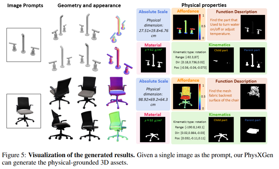 • 생성 모델 (PhysXGen) : 물리적 속성과 3D 구조의 상관관계를 latent space에서 동시에 학습하는 dual-branch 구조의 feed-forward 3D 생성 모델 PhysXGen을 제안하였습니다. 물체의 구조적 특징과 물리적 특성을 함께 고려하는 네트워크를 통해 shape-appearance와 physics 사이의 latent 상호 의존성을 학습하고, 그 결과 무게나 움직임 등이 현실에 부합하는 3D 객체를 만들어낼 수 있었다고 합니다.