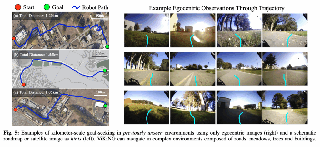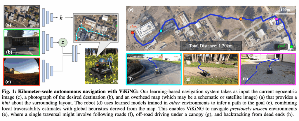 실제로 ViKiNG알고리즘은 42시간의 분량의 주행 데이터로 학습되었고 학습데이터에서 80m 보다 긴 이동 경로를 본적이 없음에도 불구하고 해당 알고리즘은 지리적 힌트 정보를 통해서 2km 이상 떨이진 목표지점을 잘 찾아가는 모습을 보였다고 합니다. 아래 (a)가 위성지도를 지리적 힌트로써 모델의 입력으로 들어가고 (b)목표지점 (c)내가 현재 보고있는 관찰 상태를 통해서 모델이 어떻게 네비게이션을 수행할지 예측하는 구조라고 보시면 됩니다.