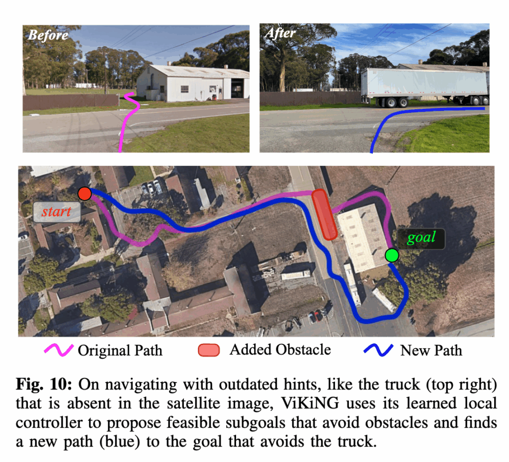 결과적으로 로봇은 실제 환경에는 없는 도로가 있다고 생각하고 원래 경로에서 벗어난 움직임을 보입니다. 근데도 목표에는 성공적으로 도달합니다. 왜냐면 잘못된 지도가 가리키는 경로가 실제로도 장애물 없는 개방된 공간 이었기 때문입니다. 이 실험은 ViKiNG이 힌트를 절대적으로 따르지 않는 것을 보여주면서 힌트가 유도하는 방향이 위험하지 않은 한에서만 가능하다는 점을 보여줍니다.
