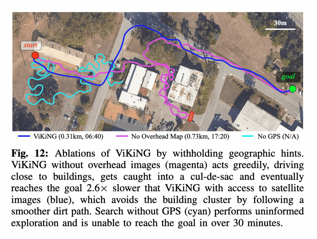 그리고 추가적으로 GPS까지 제거 (완전 uninformed search)하는 실험도 진행합니다. 이 경우에는 저자의 컨트리뷰션인 heuristic 자체가 사라져 ViKiNG-A* 는 사실상 Dijkstra 같은 무정보 탐색을하게 되는데, 이 경우 로봇은 주변을 무작정 탐색하게 되고 30분이 지나도 목표에 도달하지 못하는 모습을 보인다고 합니다. 결과는 위 피규에서 확인하실 수 있습니다.